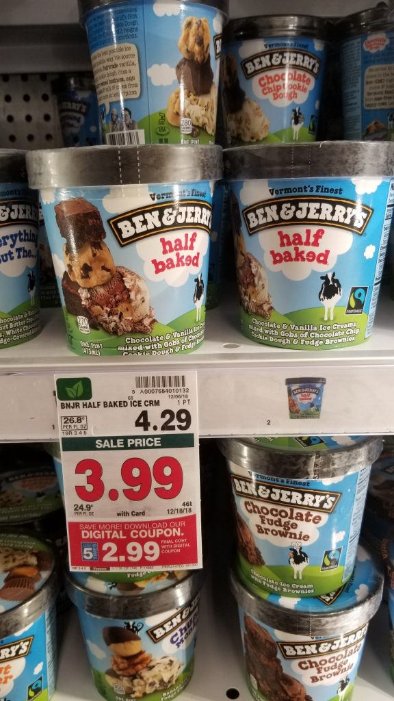 Use: (1) $1/1 Ben & Jerry’s Pints, any variety (16 fl oz) (Kroger 5x Digital Coupon)