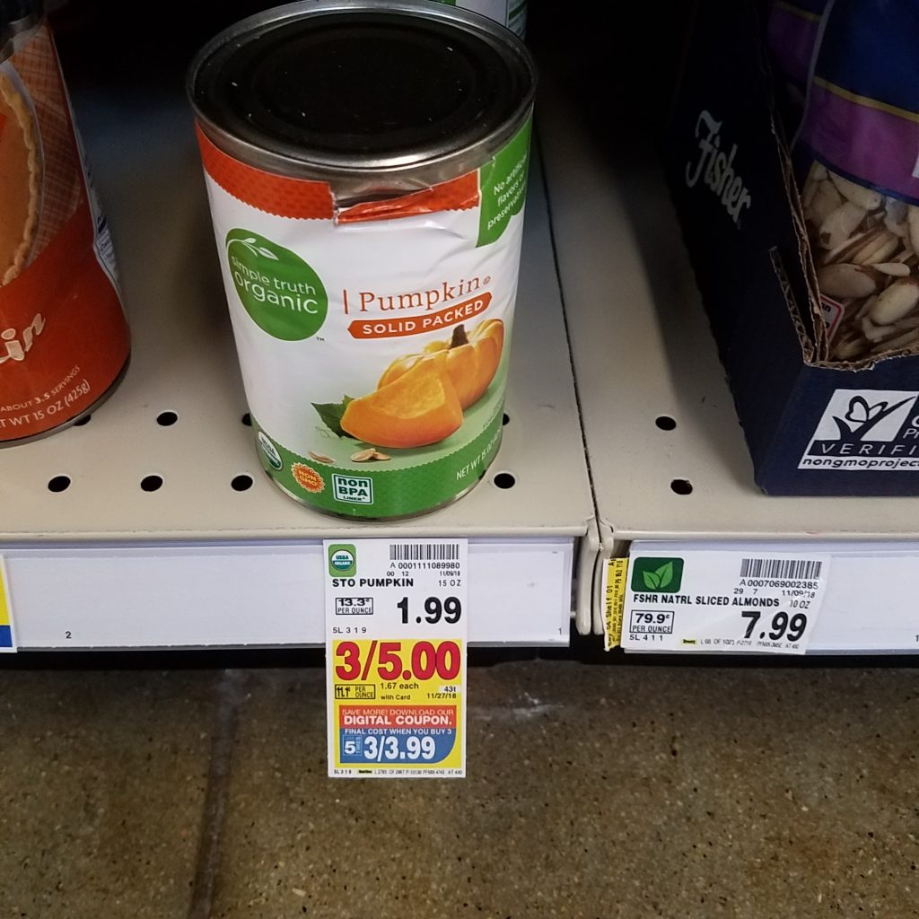 Use: (1) $1/3 Simple Truth Organic Pumpkin (15-15.25 oz). (Kroger 5x Digital Coupon)