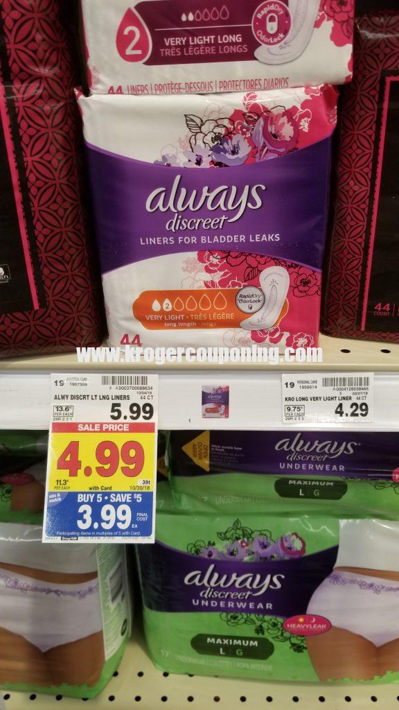 Use: (1) $2.00/1 Always Discreet Incontinence Liner or Pads – 9-30-18 PG; Excludes Trial and Travel Size; Limit of 1 Like Coupon Per Household Per Day (exp 10/27/18)