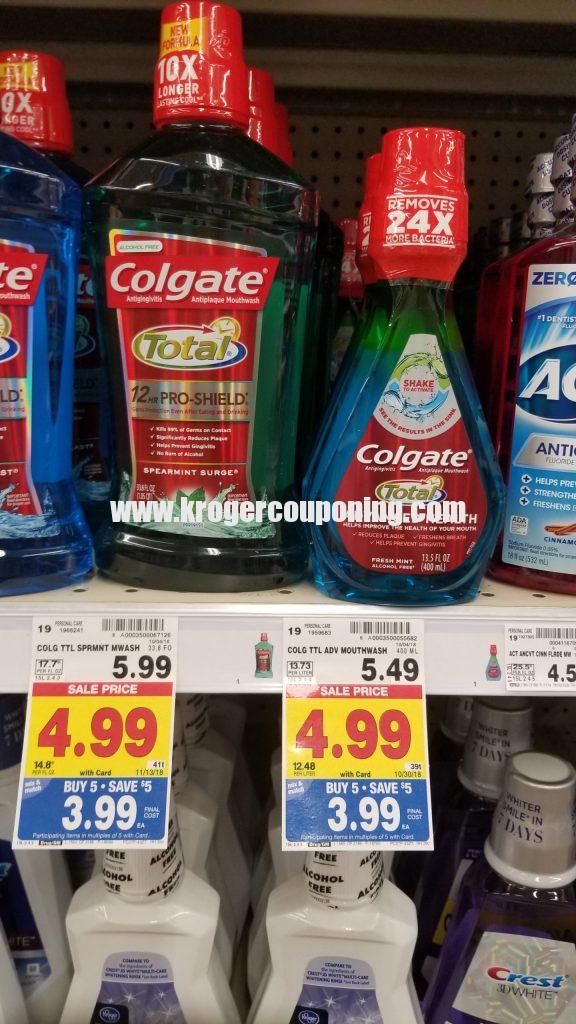 Use: (1) $2.00/1 Colgate® Mouthwash or Mouth Rinse (400 mL or larger) Kroger Digital Coupon – Limit 1 (exp 10/30/18)