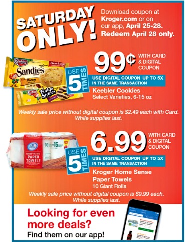 Here are a couple of Saturday ONLY deals. Load your new 5x coupons for Keebler Cookies or Korger Home Sense Paper Towels. Stock up this Saturday ONLY! Download your coupon from April 25-28, then redeem April 28 ONLY. Use up to 5 times in a single transaction.