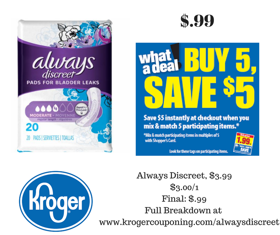 –$3/1 Always Discreet Incontinence Pads (not valid on other Always products) (excludes trial/travel size)