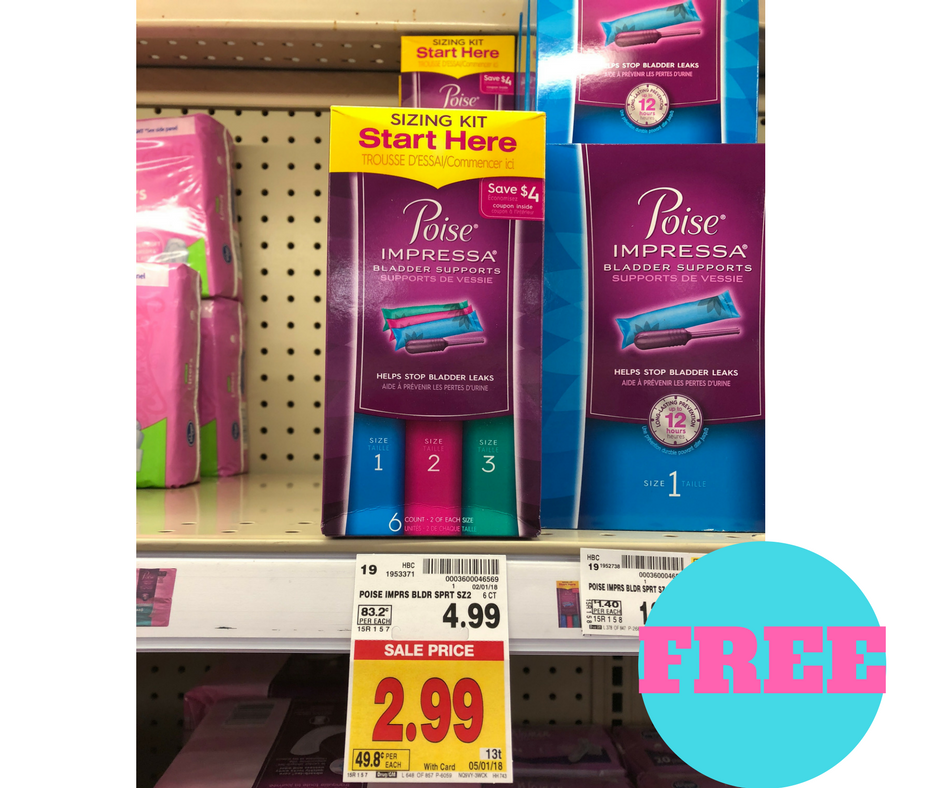 Here’s a great deal on Poise impressa Sizing Kit at Kroger!!! This deal is HOT and you don’t want to miss it! Poise Impressa is on sale for $2.99 thru 5/1 and there is a printable coupon that matches up with the sale!