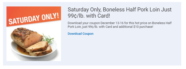Today only you can grab Boneless Half Pork Loin for just $.99 lb. Remember that this coupon is good for TODAY only! So, run out and grab this deal today while you can!
