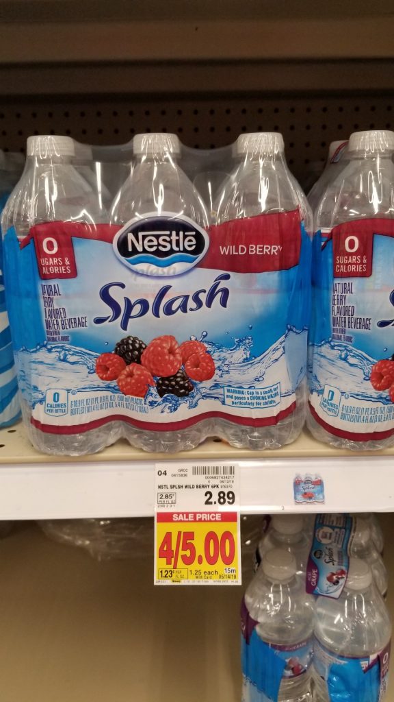 Nestle Splash Water just $.75 This post contains affiliate links, please read our Affiliate Disclosure hereApril 24, 2018 by wendy Leave a Comment Buy 2 Nestle Splash Water, 16.9 oz 6 pk $1.25, sale price through 5/13 Use one $1.00/2 – Nestle Splash Water, Kroger ClickList eCoupon Final Price: $0.75 each, when you buy 2