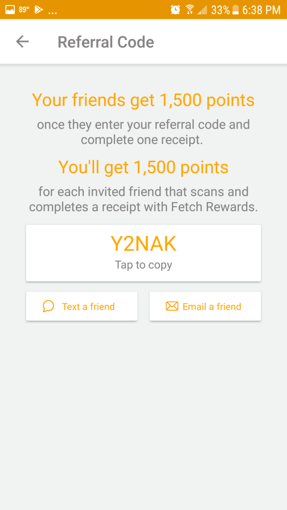Here is how to sign up! Download the Fetch Rewards App on your phone or tablet. Start the sign up process. Once you complete the sign up process. Click on the “Me” icon at the bottom of the screen! Click on the “referral code” then at the bottom click on enter code. And, enter Y2NAK. Then you will earn 1500 Bonus reward points when you scan your first receipt!
