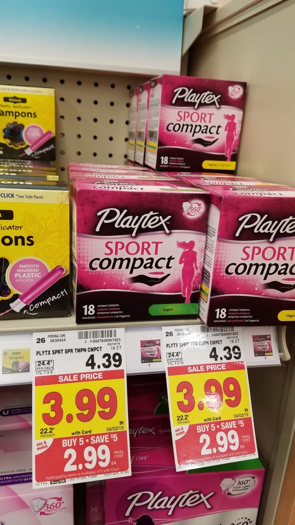 Buy: (1) Playtex Sport Compact Tampons, 18 ct, $1.99 wyb 5 mega sale items thru 4/2 Use: (1) $1.00/1 Playtex Sport or Gentle Glide Tampons printable