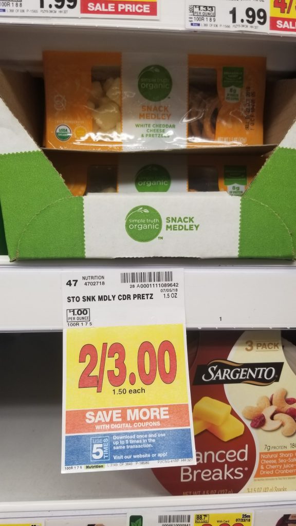 Use: Save $0.25 on Simple Truth Organic™ Snack Medley When you buy ONE (1) Simple Truth Organic™ Snack Medley, any variety (1.5oz) Kroger Digital 5X Coupon