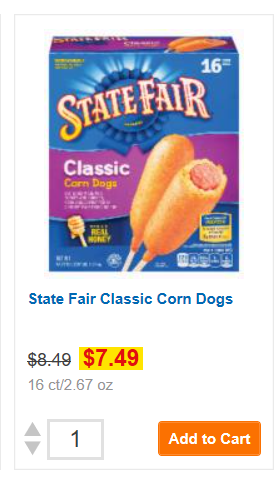 State Fair just $6.94 This post contains affiliate links, please read our Affiliate Disclosure hereJuly 19, 2017 by wendy Leave a Comment Here’s a another deal for quick lunch for the kiddos this summer. I’m ready for school to go back. How about you? State Fair Corn Dogs, 16 ct, $7.49 $0.55/1 State Fair Corn Dog Product