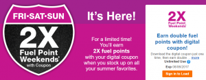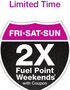 2x Weekend Fuel Points – Limited Time! This post contains affiliate links, please read our Affiliate Disclosure hereMay 2, 2017 by wendy Leave a Comment For a limited time only, you can earn 2x fuel points!Download the Digital Coupon here just ONE time.Earn double fuel points when you shop on Fridays, Saturdays and Sundays thru August 6th!Don’t forget – the B4S$4 Mega Sale ends 5/9 – Find all the BEST DEALS here!