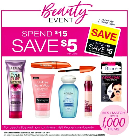 New Kroger Beauty Event starts today thru 3/20. Mix & Match – Spend $15, Save $5. Stay tuned for deals and let me know what kind of deals you find!