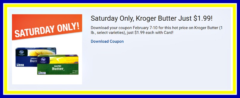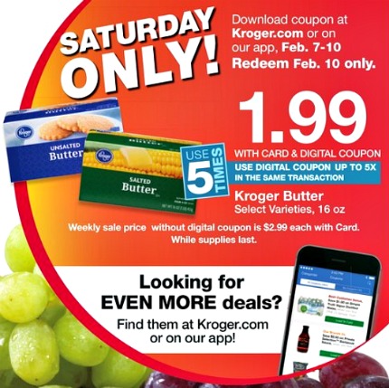–$0.80/1 Kroger Butter, 16 oz, (Kroger 5x’s Digital Coupon) exp 5/19