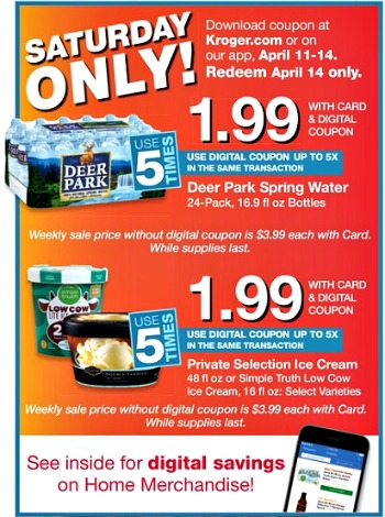Reminder to load your new 5x coupons for Deer Park and Ice Cream. Stock up Saturday ONLY! Download your coupon from April 11-14, then redeem April 14 ONLY. Use up to 5 times in a single transaction.