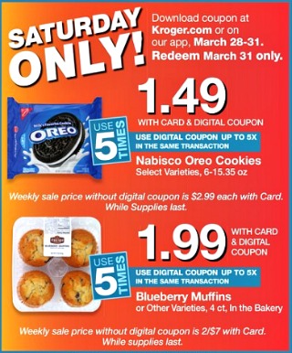 –$1.50/1 Blueberry Muffins or Other Varieties In the Bakery, 4 ct (Kroger 5x’s Digital Coupon) exp 3/31